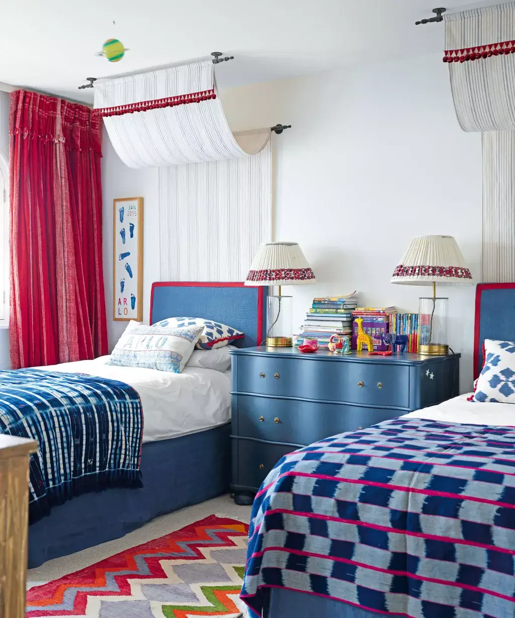 Of course, not all designs need to be as big and bold as the beautiful space shown above from Mind the Gap, layering patterns and creating elegant contrasts with different fabrics can be just as effective and stylish with calmer color palettes and small-scale patterns.